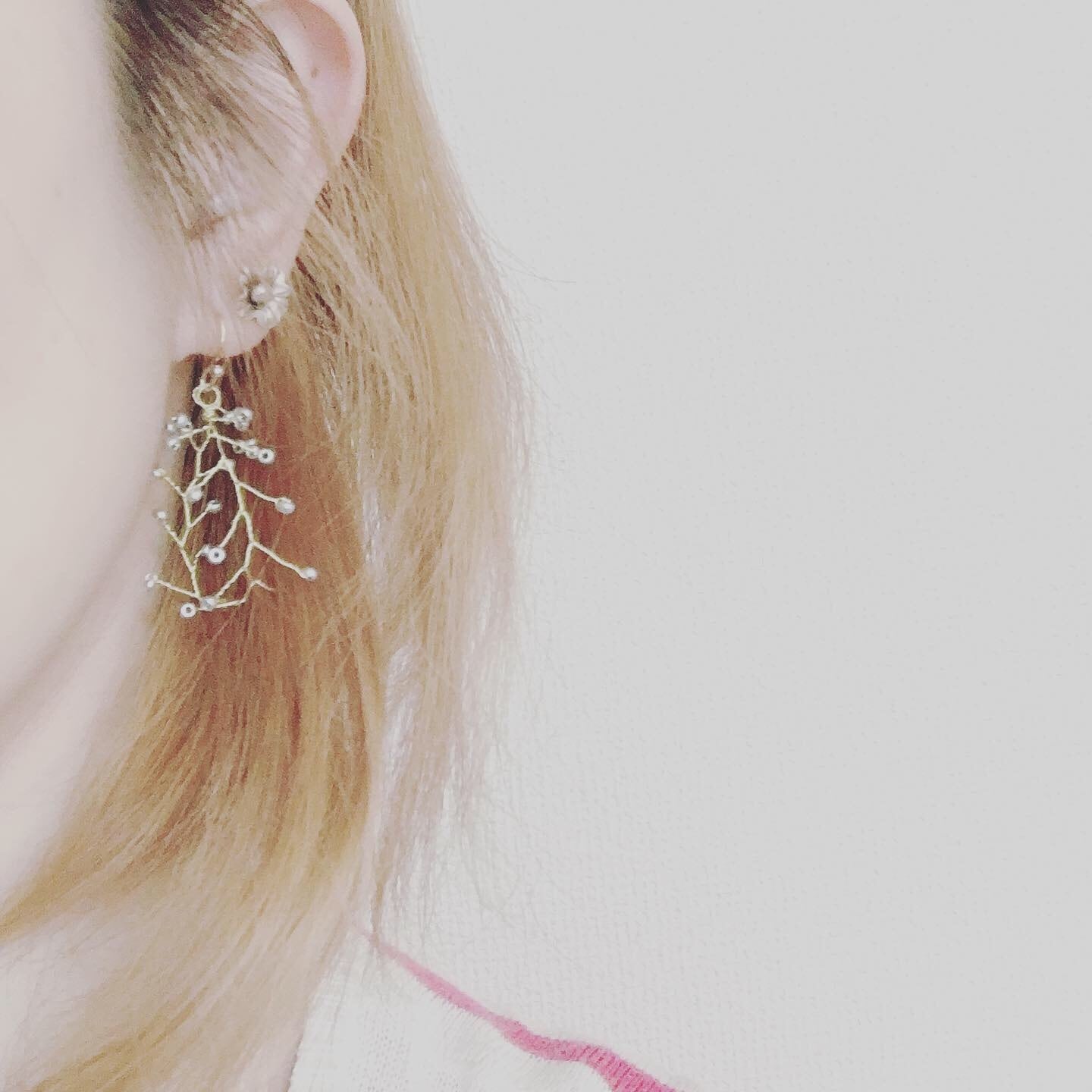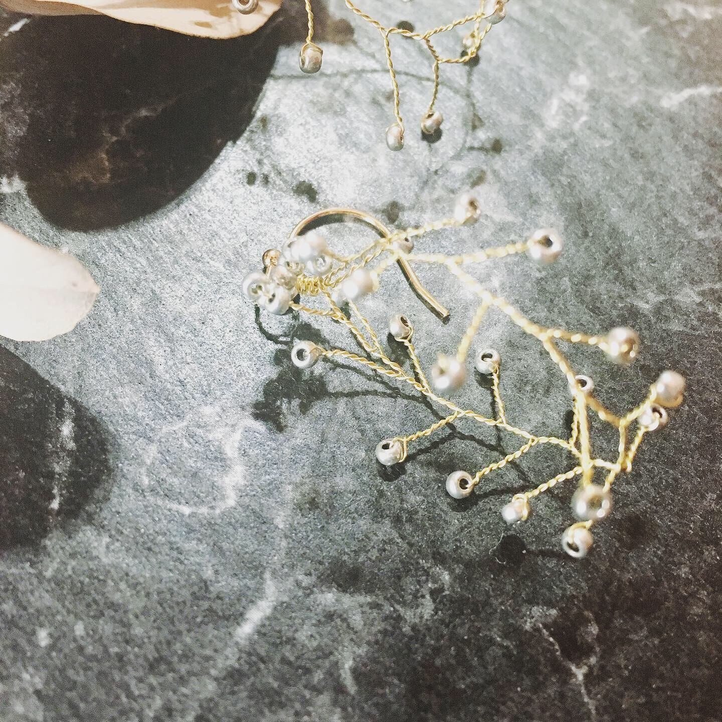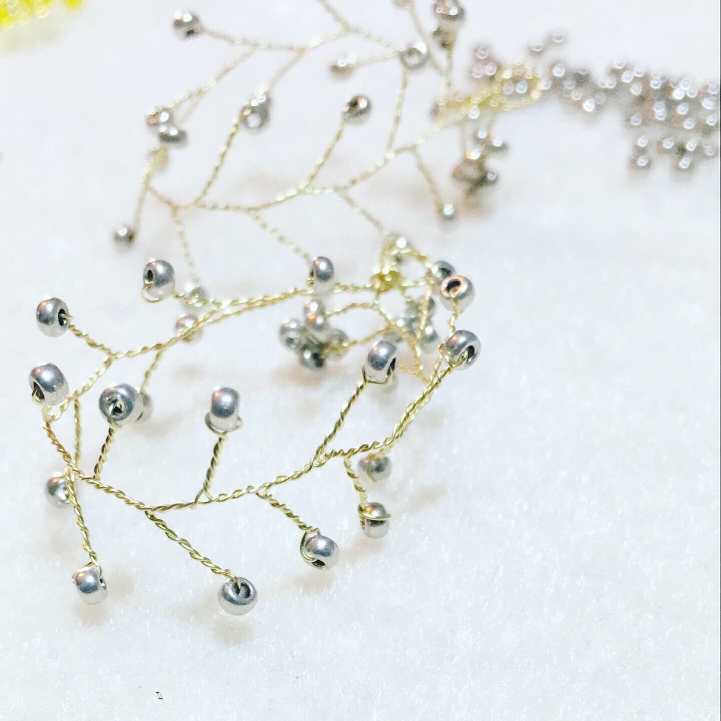 ビーズをワイヤーでねじり上げ 小枝風にしたものをフープにしてみました◎