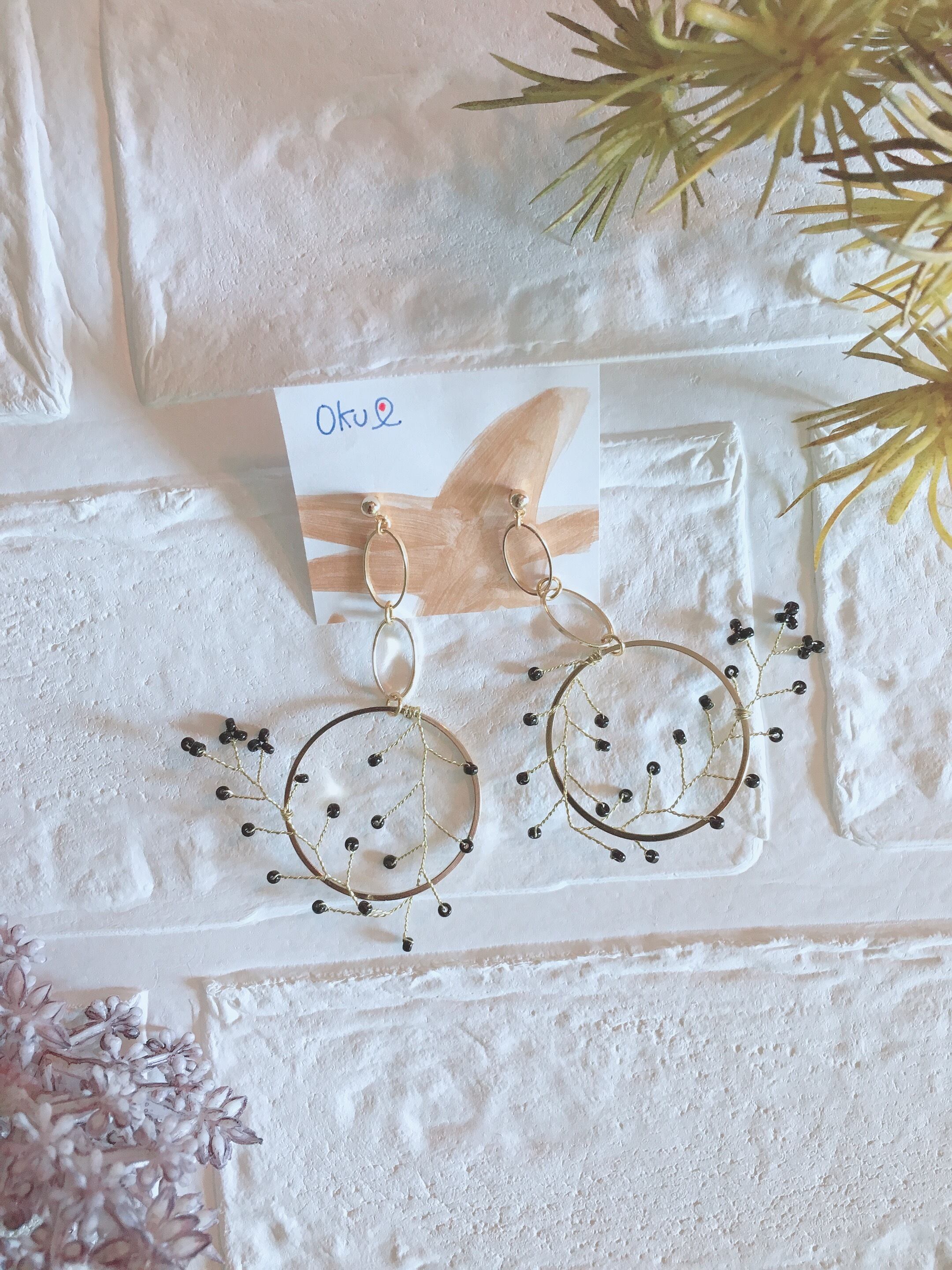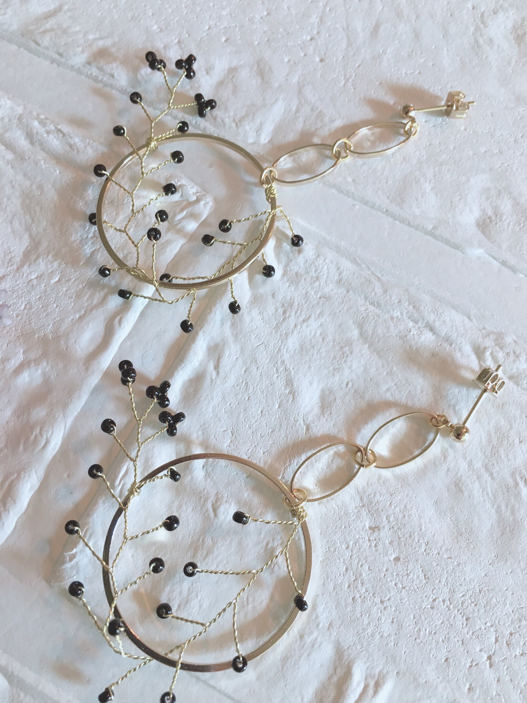 メタルフープと小枝のようにワイヤーとビーズを使って作ったパーツを絡めた揺れるピアス