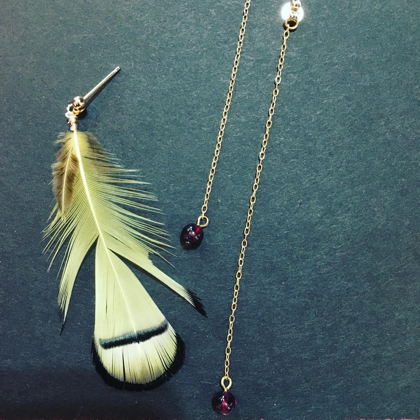 フわっと軽い羽の後ろに垂れ下がるガーネットのバックデザインは他のピアスにもつかえて◎